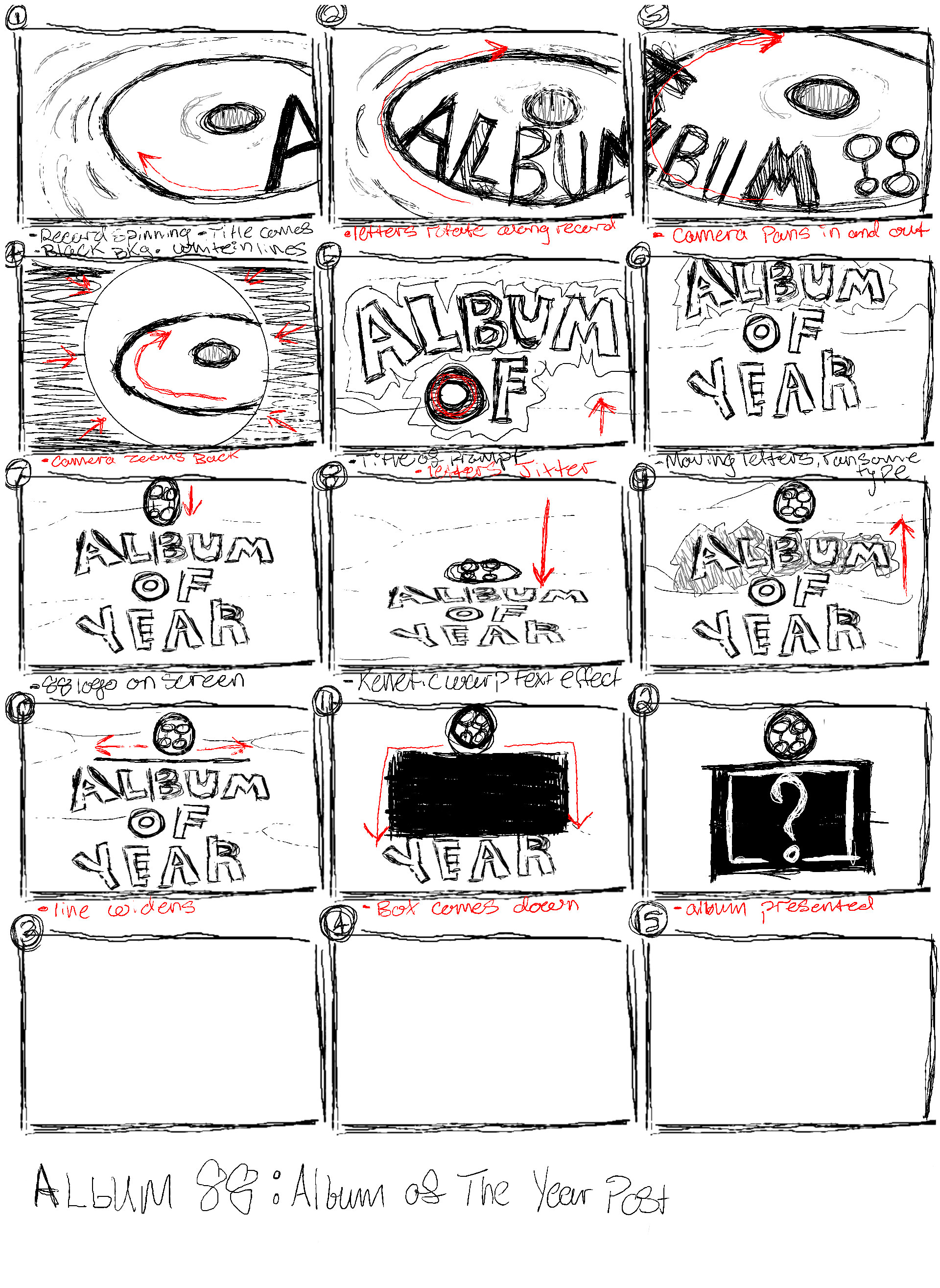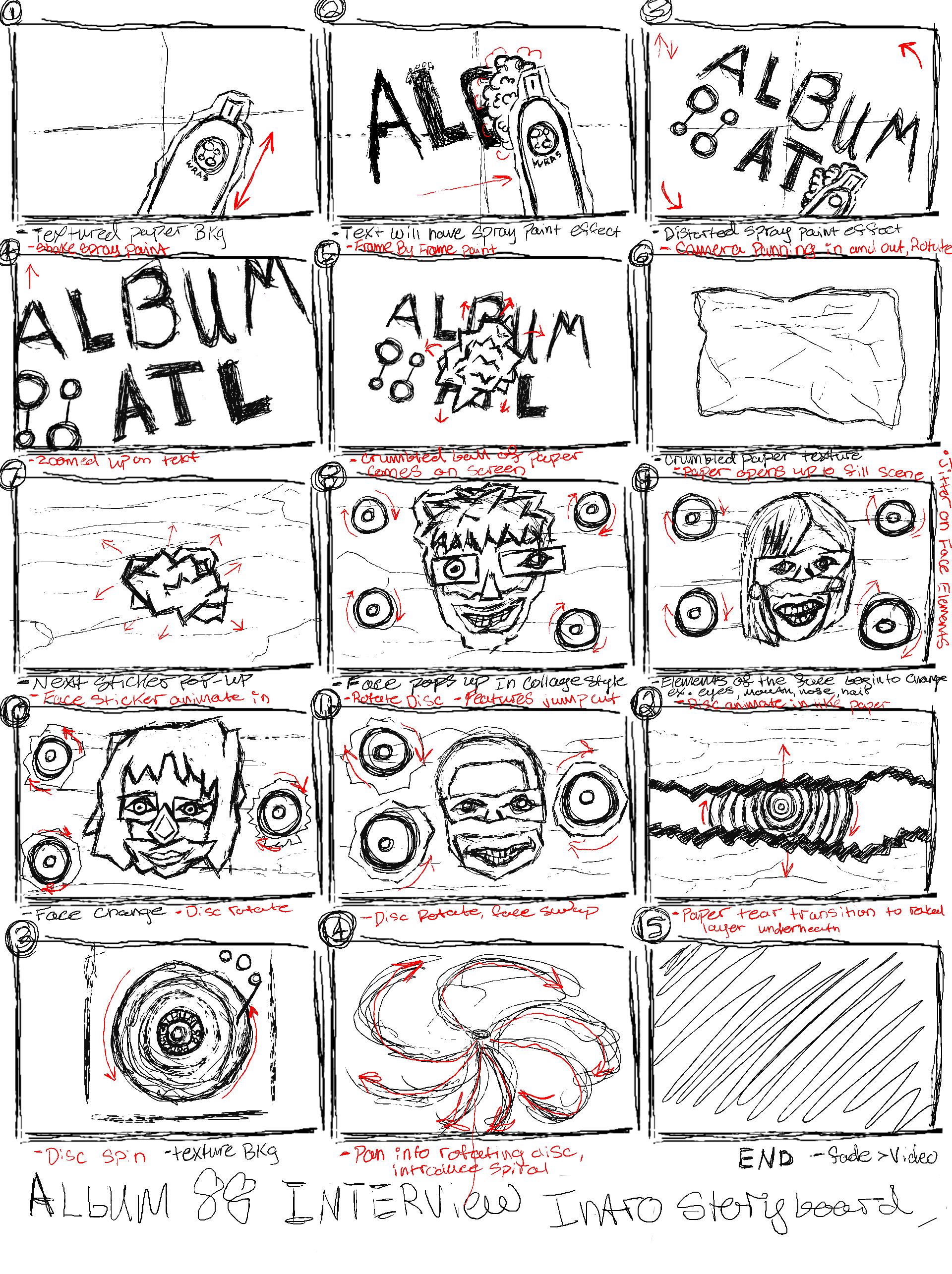 For this project when I first heard that it was for a podcast show where DJs interview different artist I instantly had this idea of mixing different faces together. This idea symbolized all the different personalities and people you would meet when watching the show. In my storyboard it starts off with an Album 88 themed spray can spraying the title highlighting Atlantas prominent graffiti and urban life style. Using mixed media allowed for me to do a collage of different elements ranging from different textures, colors, typography and overall design. The middle sequence highlights the different DJs that host the interviews faces switching. Finally the paper rips open and reveals a vinyl record spinning. The record then spins into a dark fade which would then transition into the interview.