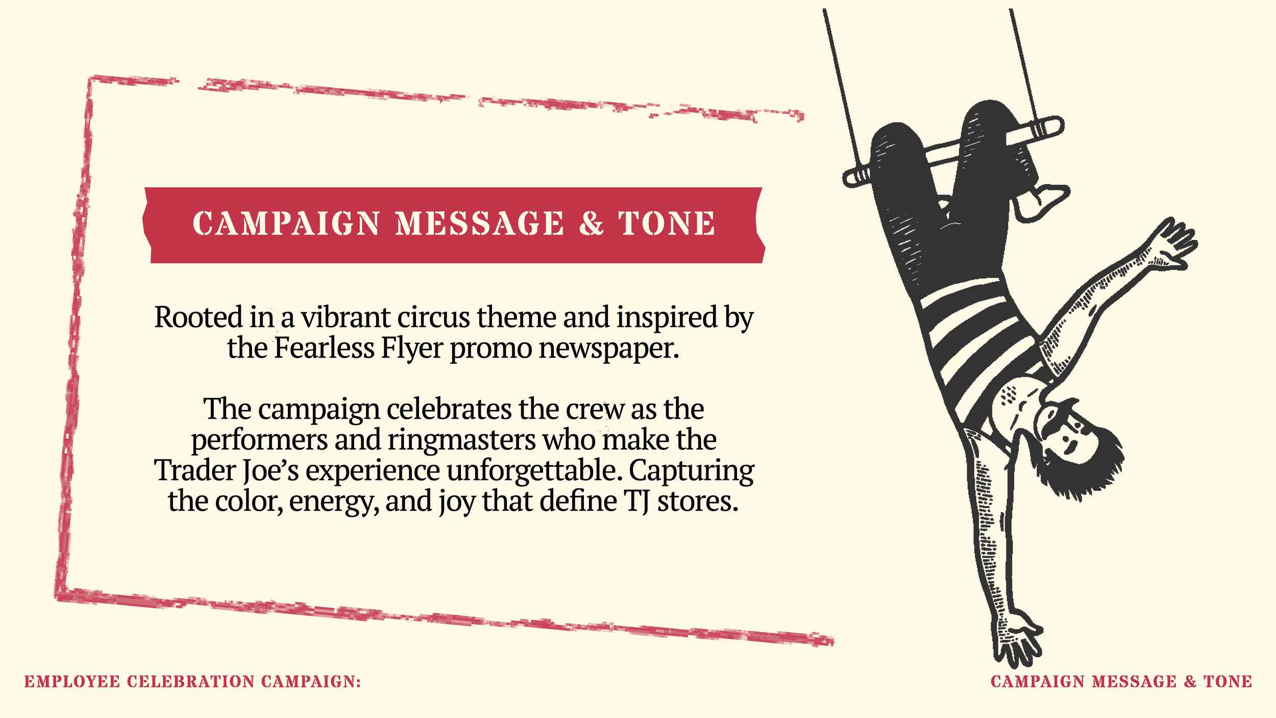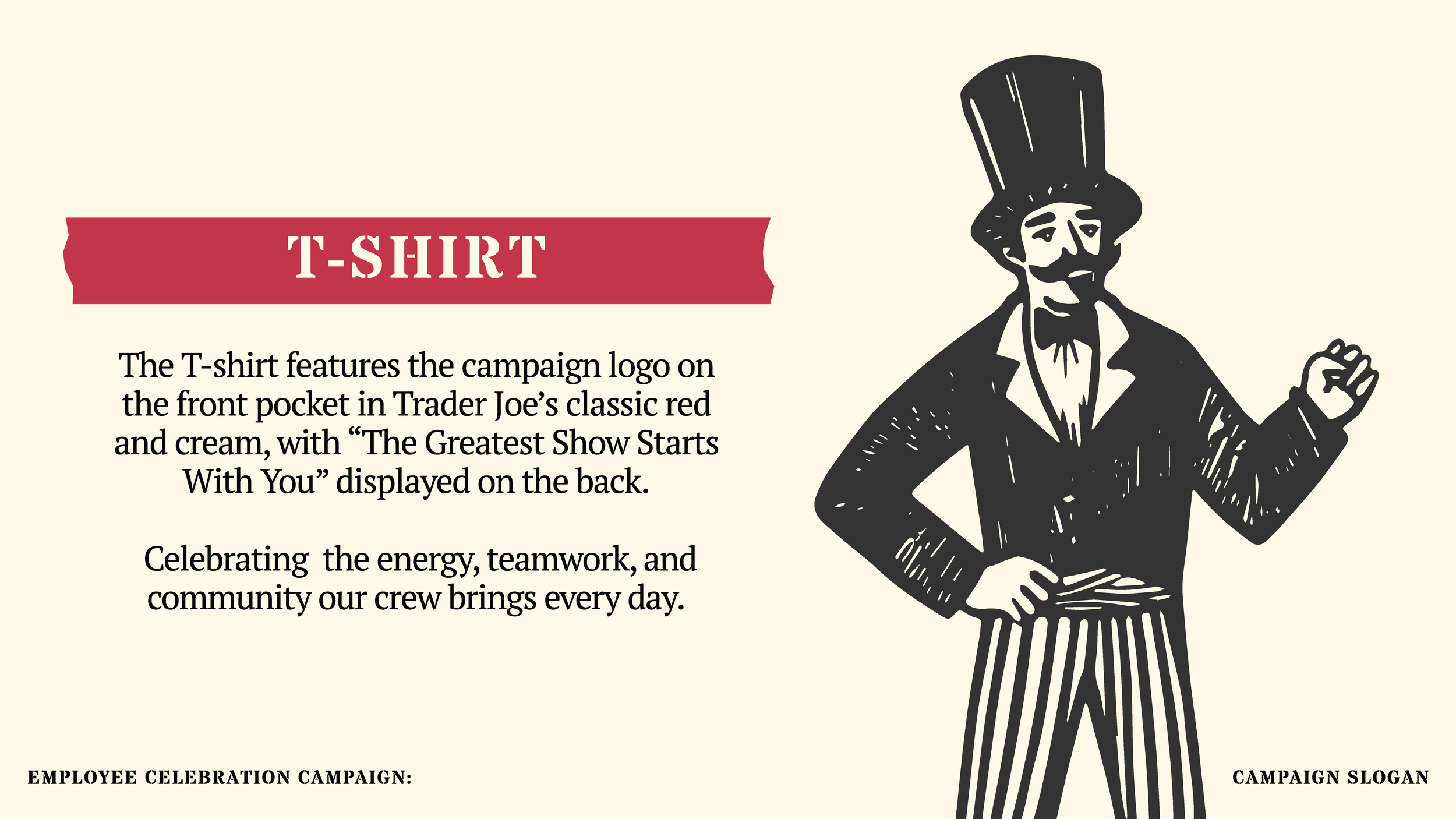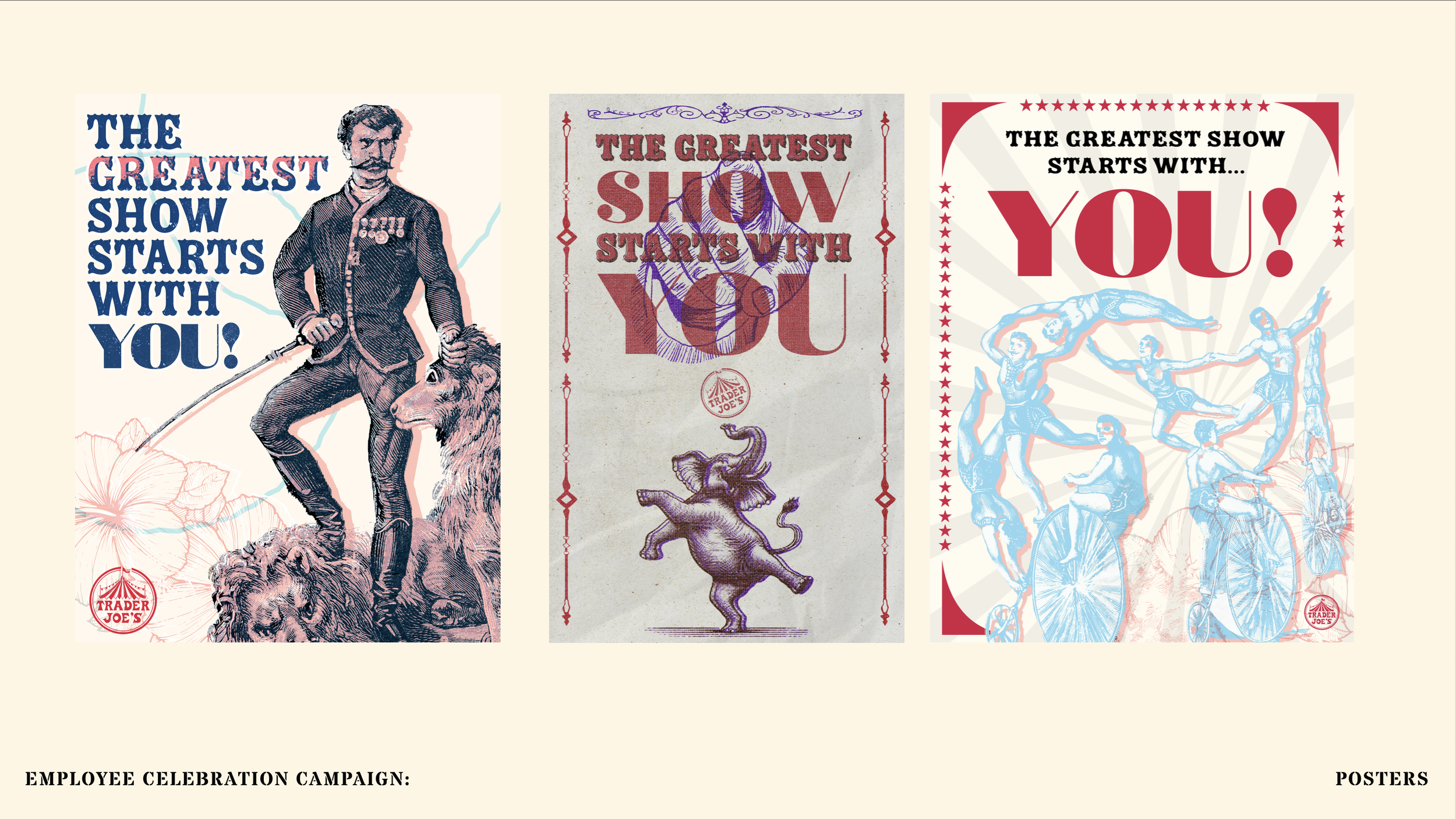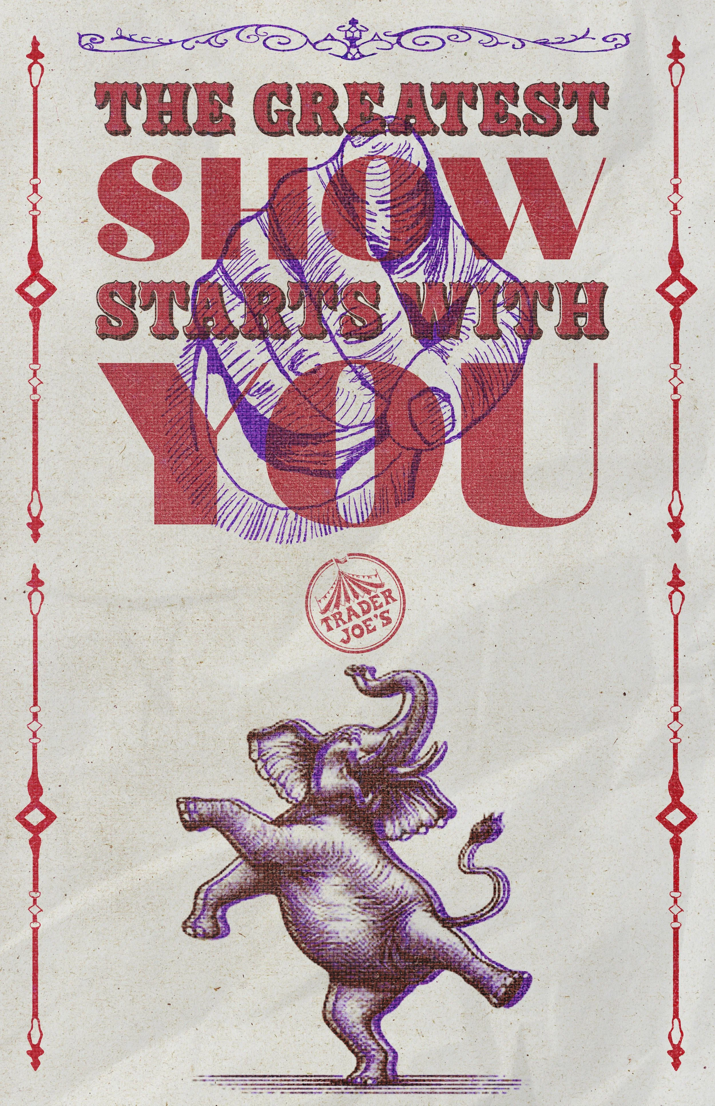 This saying became our slogan for our internal campaign as we wanted to emphases that what really makes a company thrive is its foundation of hardworking employees. With the theme of our campaign being vintage international circus, we thought the name fight perfectly with our tone and style. Trader joes being known for outsourcing from many different markets bringing together foods from all over the world, just like an international circus show.