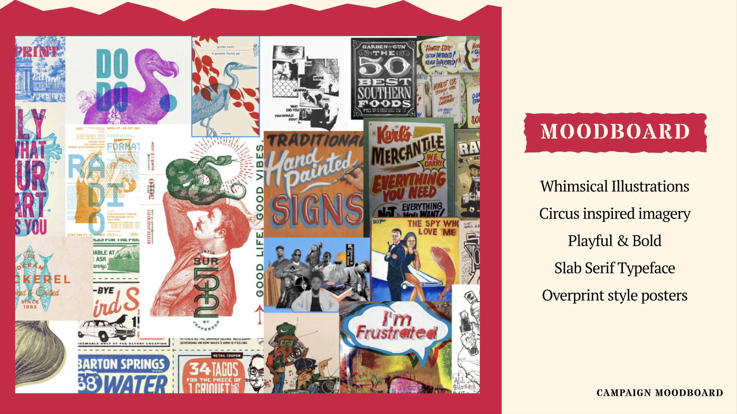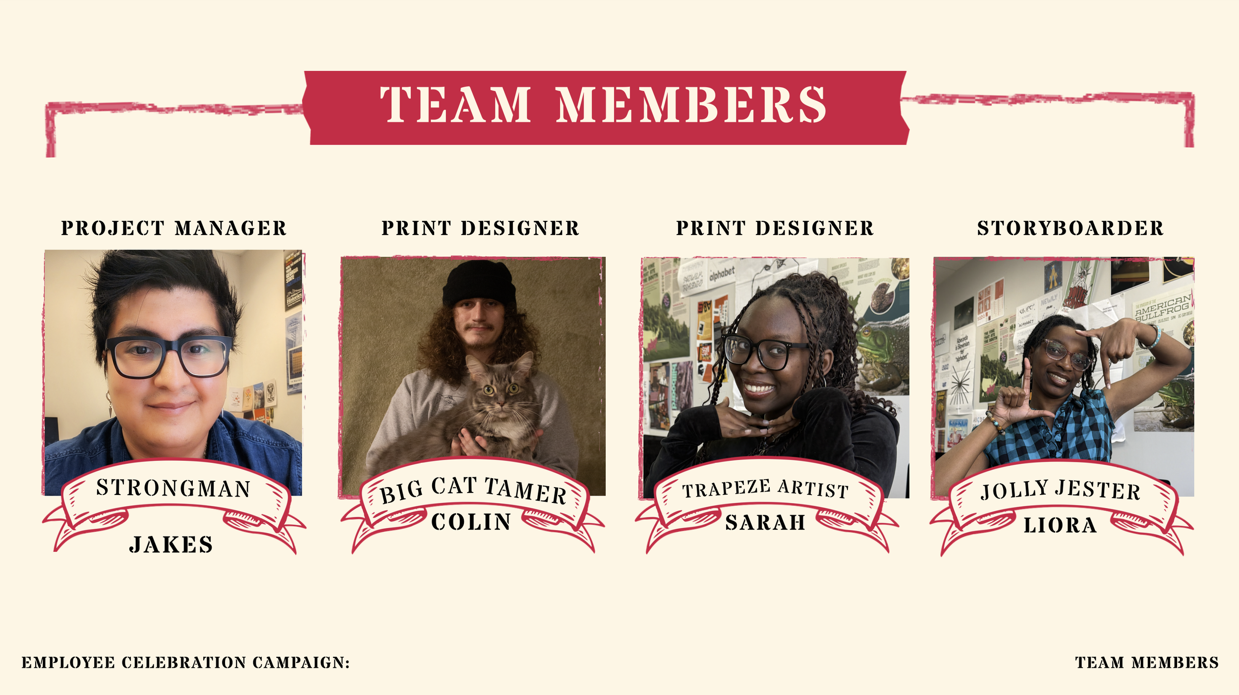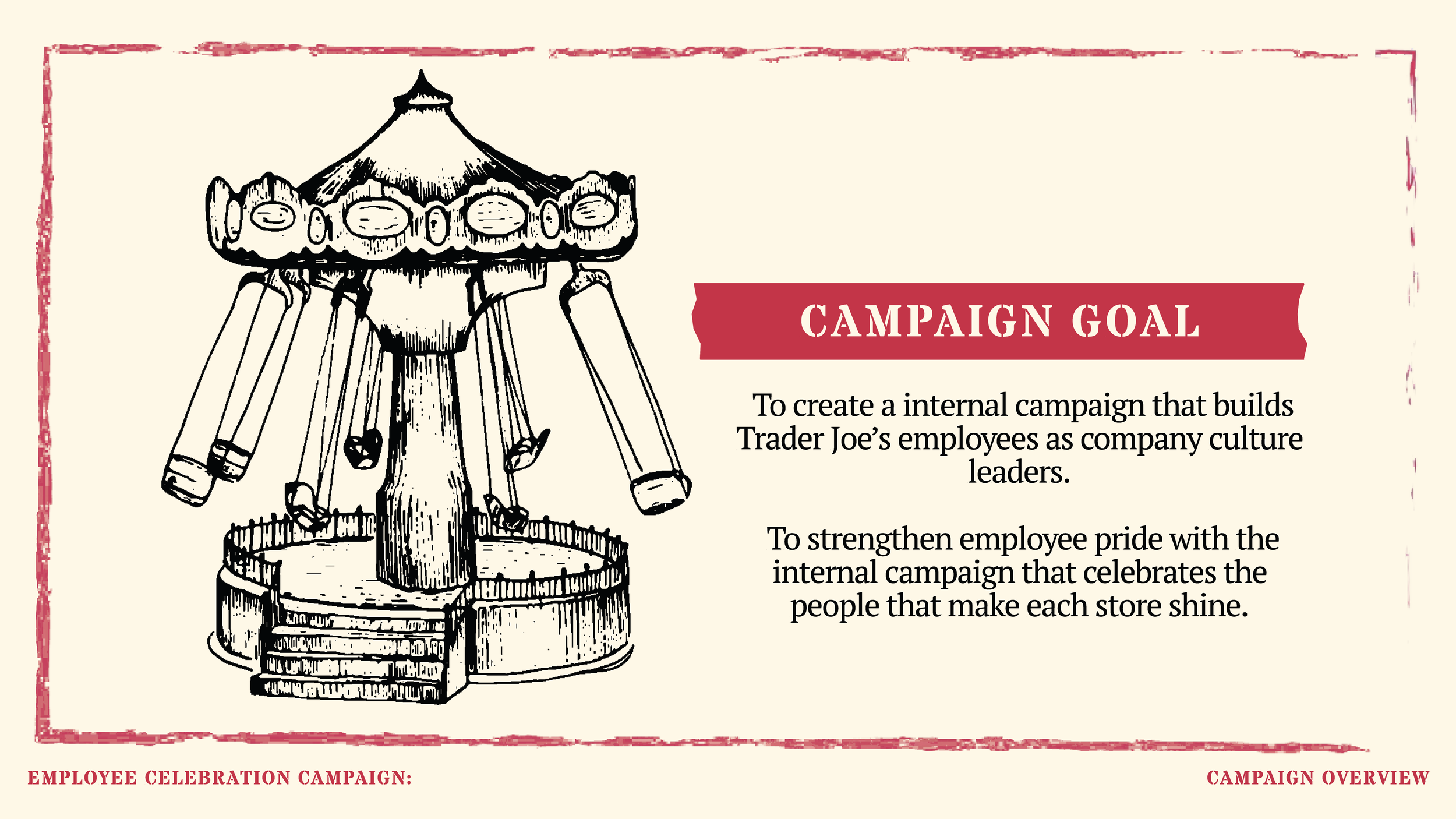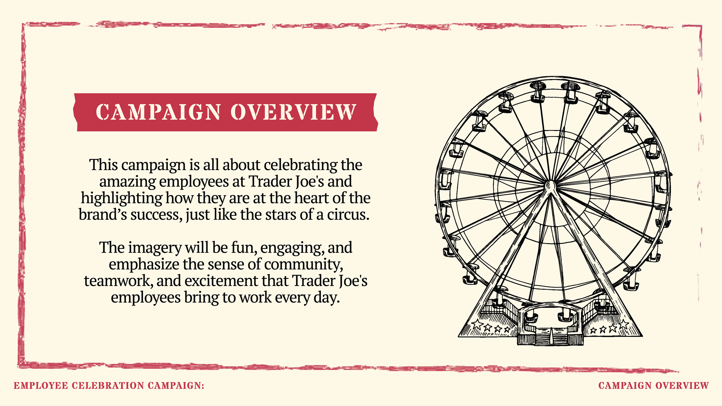 This saying became our slogan for our internal campaign as we wanted to emphases that what really makes a company thrive is its foundation of hardworking employees. With the theme of our campaign being vintage international circus, we thought the name fight perfectly with our tone and style. Trader joes being known for outsourcing from many different markets bringing together foods from all over the world, just like an international circus show.